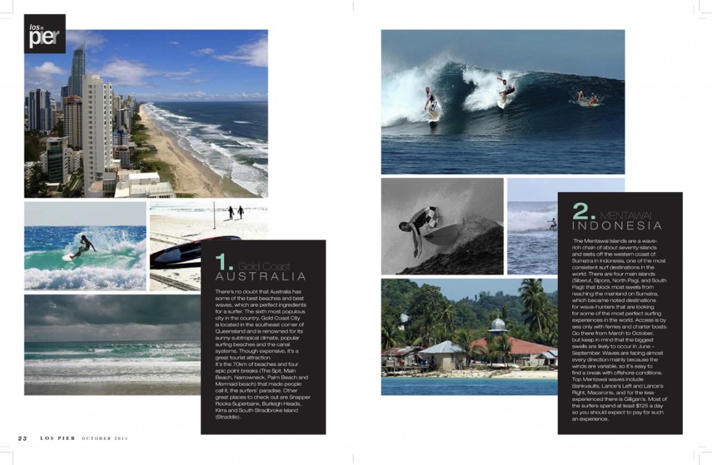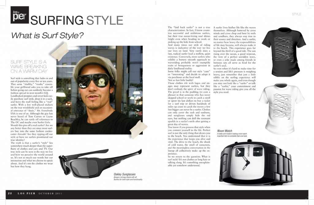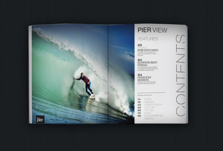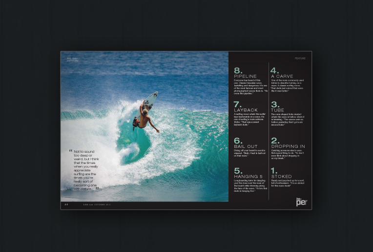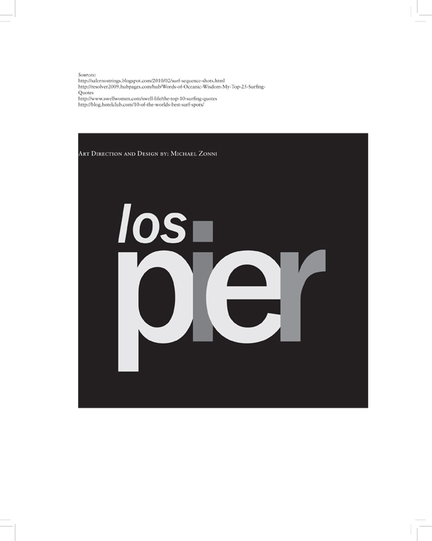 This is a surf magazine that I created from scratch. The inspiration for the name “Los Pier” came from an interest that I have in the California surfing culture. The idea was to incorporate an element that is part of the beach and ocean. The pier is where one looks out from to view the break, or metaphorically to view this magazine. The word Los means “Line Of Site”, enough said.